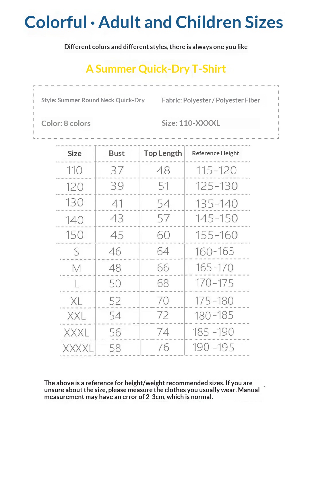 Sizes: S, M, L, XL, XXL, XXXL, 4XL, Kids 110, Kids 120, Kids 130, Kids 140, Kids 150